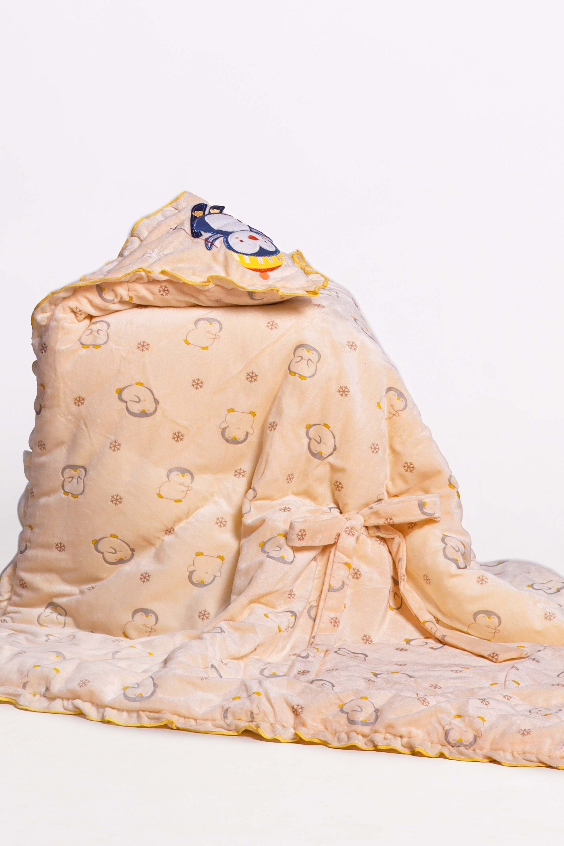 Wrap your little one in warmth and cuteness with this adorable yellow baby wrapper. Featuring a charming pattern of small, cute bear faces and flowers, this blanket is perfect for keeping your baby cozy. The hood, designed with an endearing penguin wearing a hat, adds a playful touch. The front tie with a decorative bow ensures that the blanket stays securely wrapped around your baby. The soft, plush material provides comfort and warmth, making it ideal for everyday use. This cheerful yellow color, with its bright and sunny tone, makes the wrapper a delightful addition to any nursery.