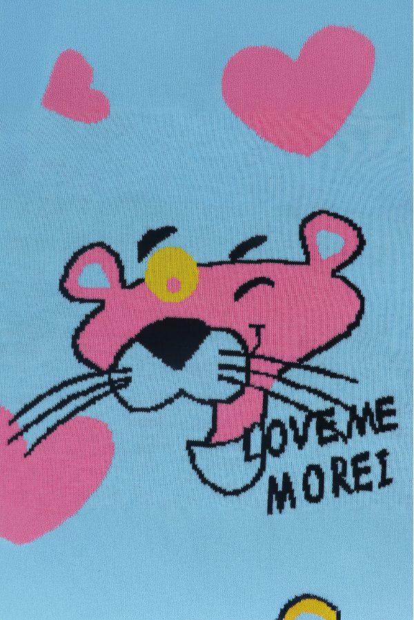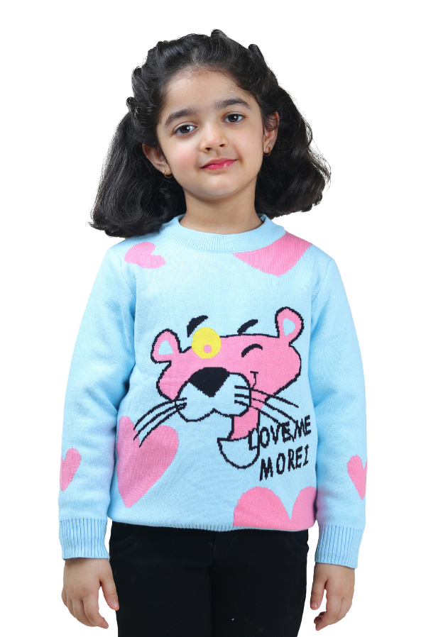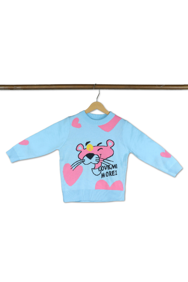 Brighten your child's wardrobe with this adorable light blue sweater, perfect for adding a splash of color and fun to their outfits. Featuring a large, cheerful graphic of a pink cartoon character with a yellow flower and surrounded by pink hearts, this sweater is sure to bring smiles all around. The playful "LOVE ME MORE!" text beneath the character adds an extra layer of charm.
