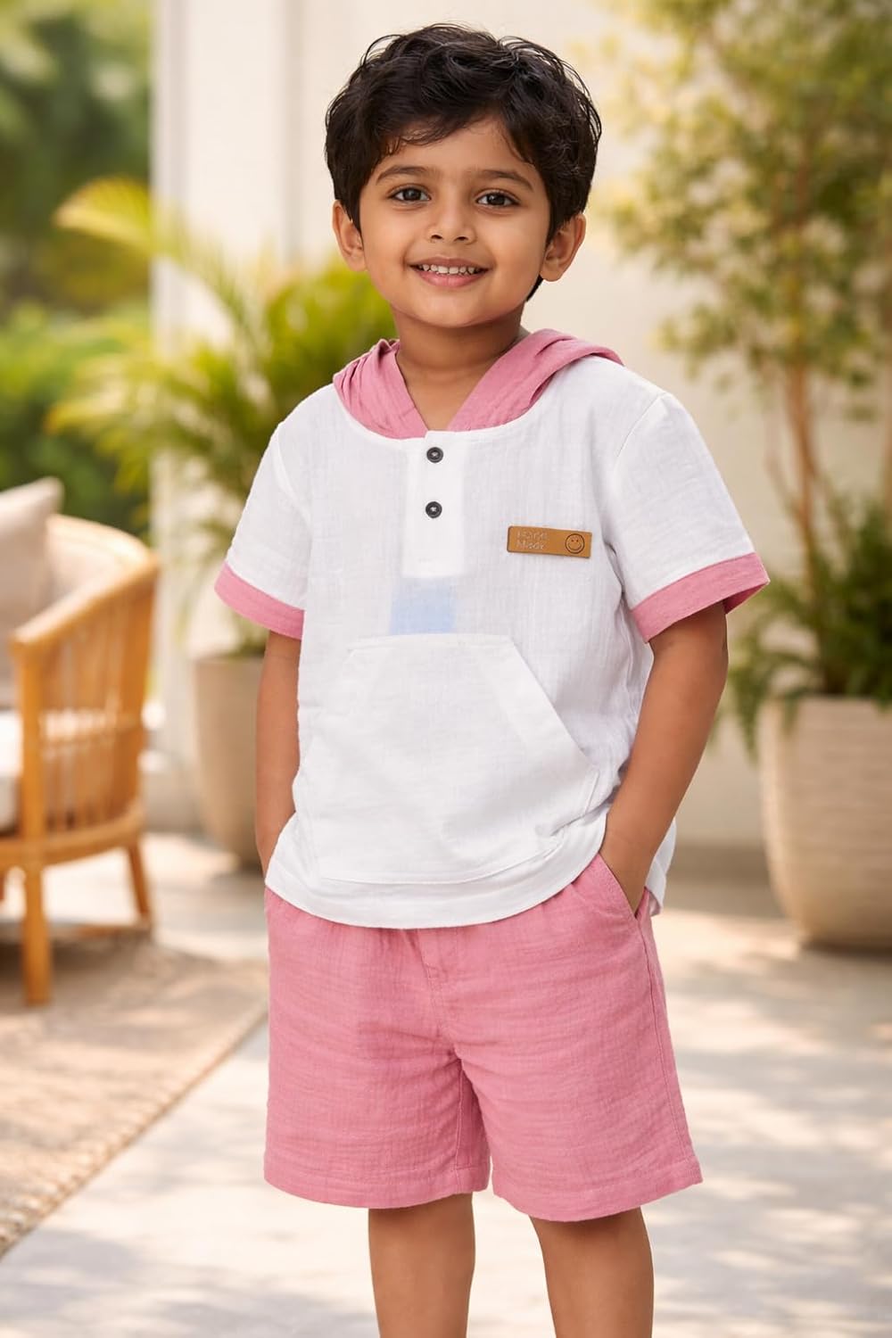 Upgrade your child’s summer wardrobe with this stylish POPSKART Boys Hooded T-Shirt and Shorts Clothing Set. Designed for comfort and style, this outfit is made from soft breathable cotton fabric that keeps kids cool during warm days. The hooded t-shirt features a button placket, kangaroo pocket, and contrast hood, giving it a trendy casual look. Paired with comfortable elastic waist shorts, this outfit is perfect for daily wear, outdoor play, holidays, and summer outings. The lightweight fabric ensures all-day comfort while the modern design keeps your child looking stylish and confident.