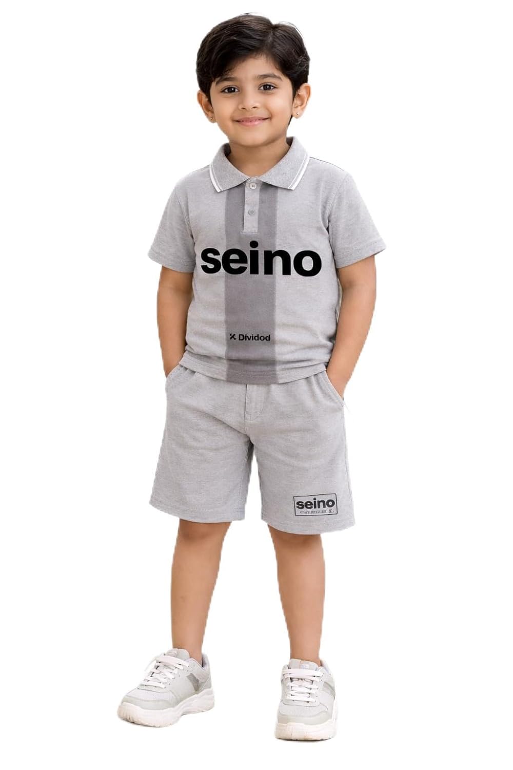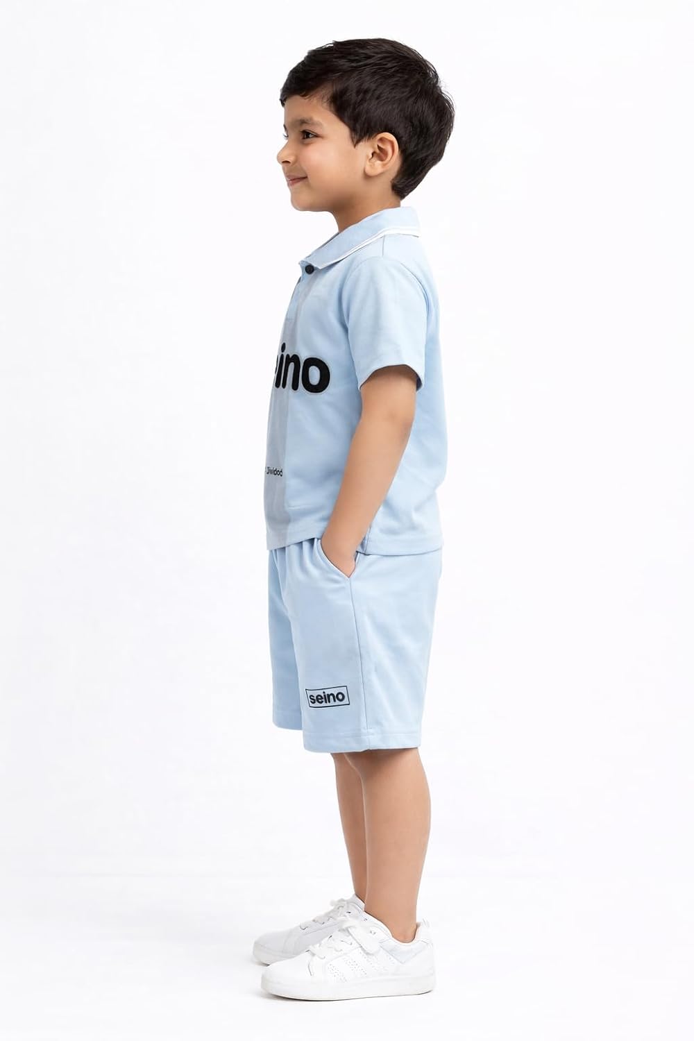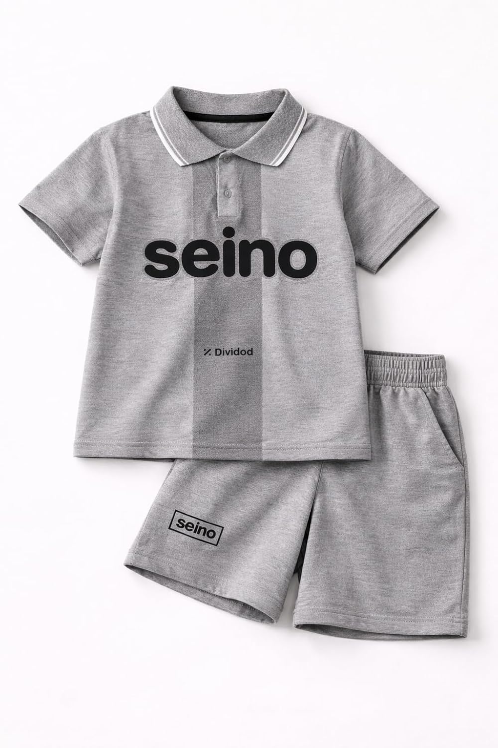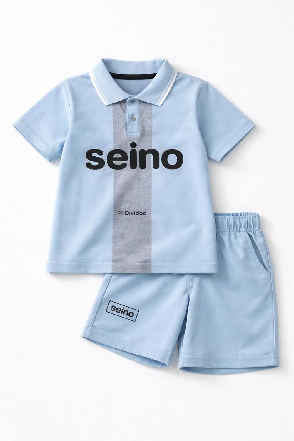 - SPORTY DESIGN: Features a classic polo collar with button placket, contrast panel detailing, and bold Seino branding on both pieces.
