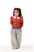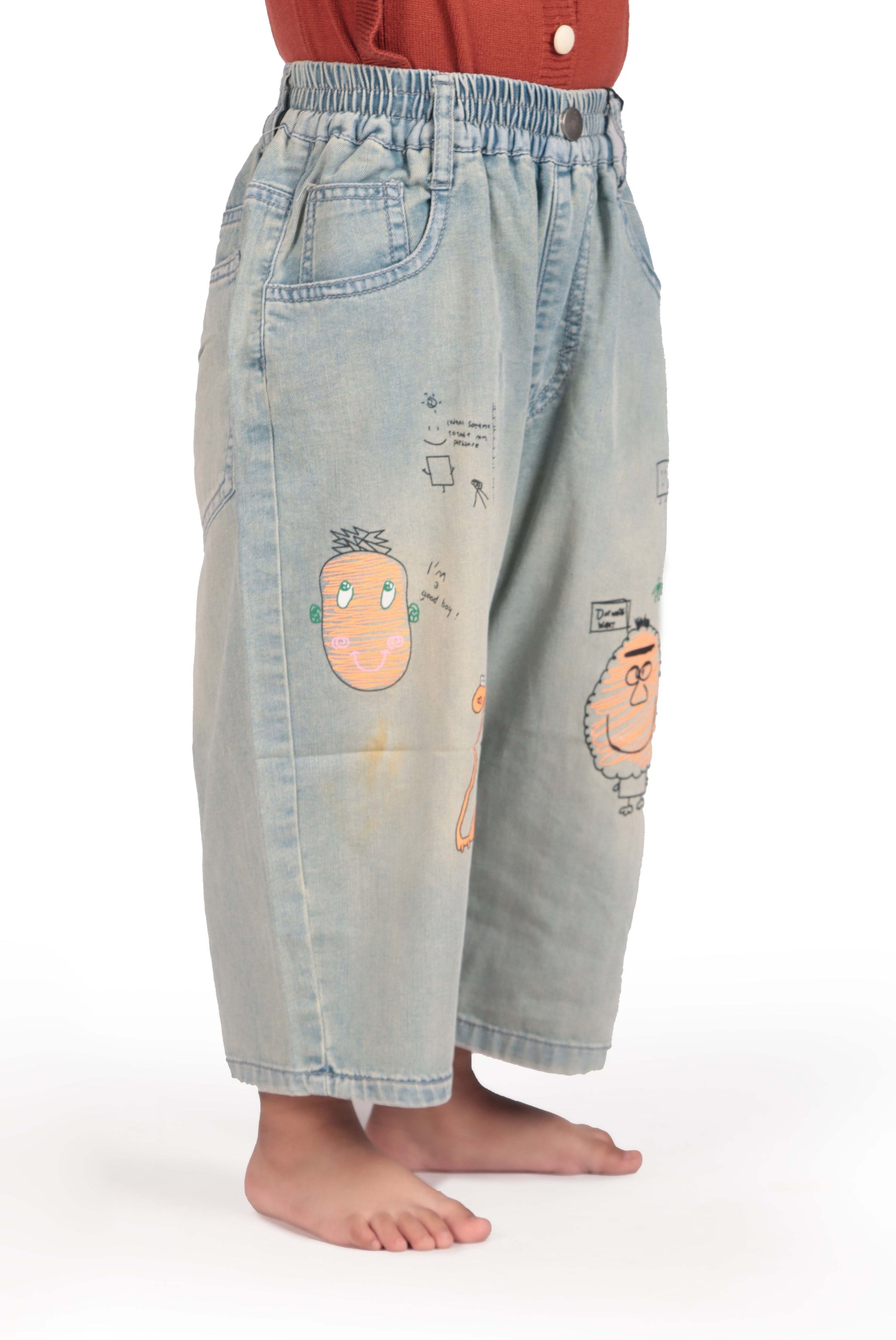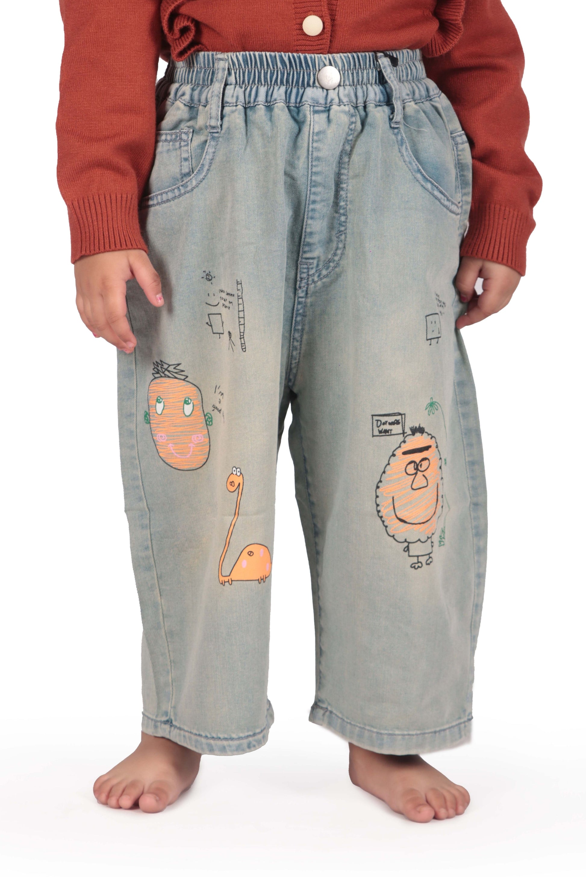 Fun and playful, these denim jeans feature colorful cartoon patches embroidered on the legs, adding a cheerful touch to your baby’s outfit. The elastic waistband ensures comfort, making them perfect for both play and casual wear.