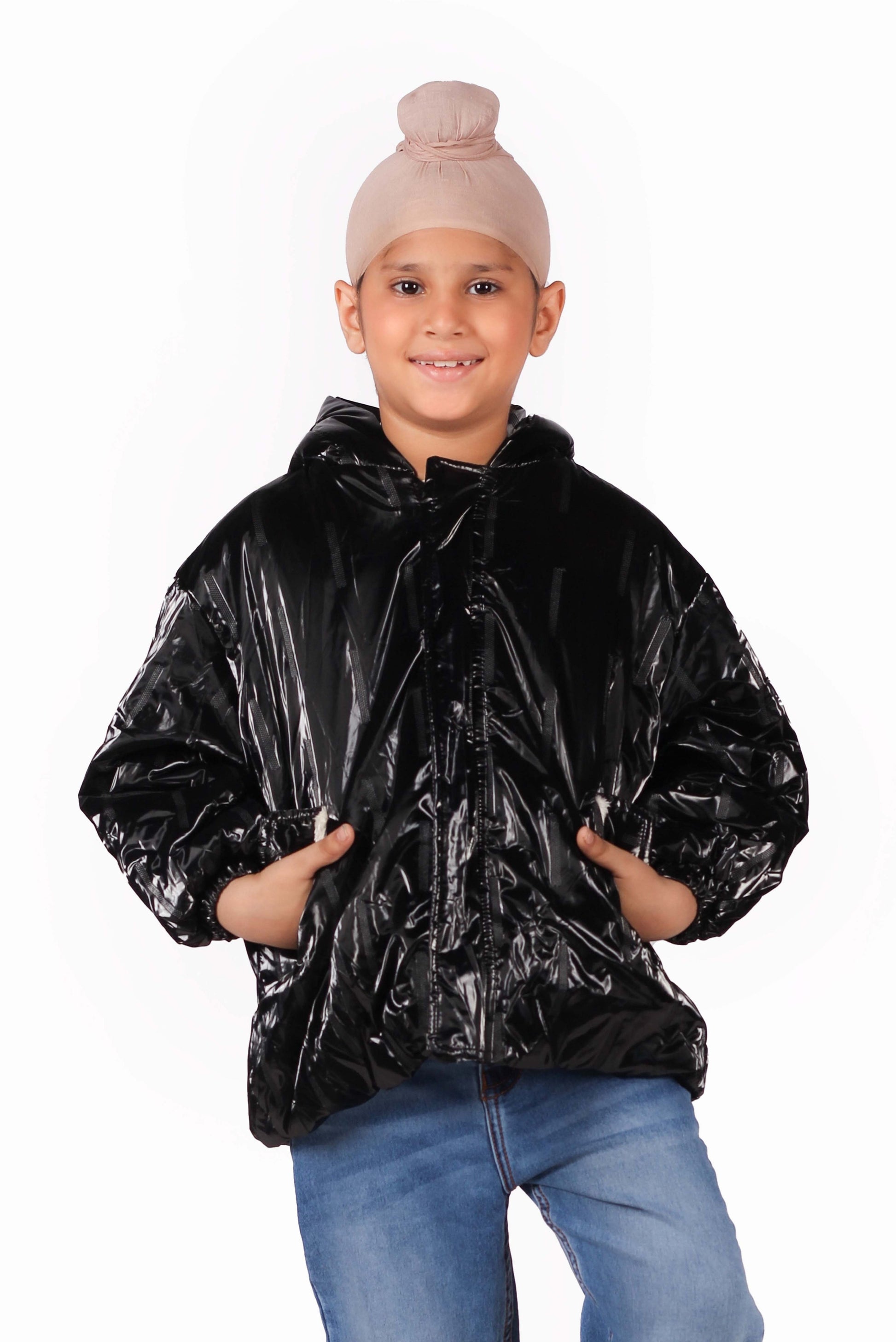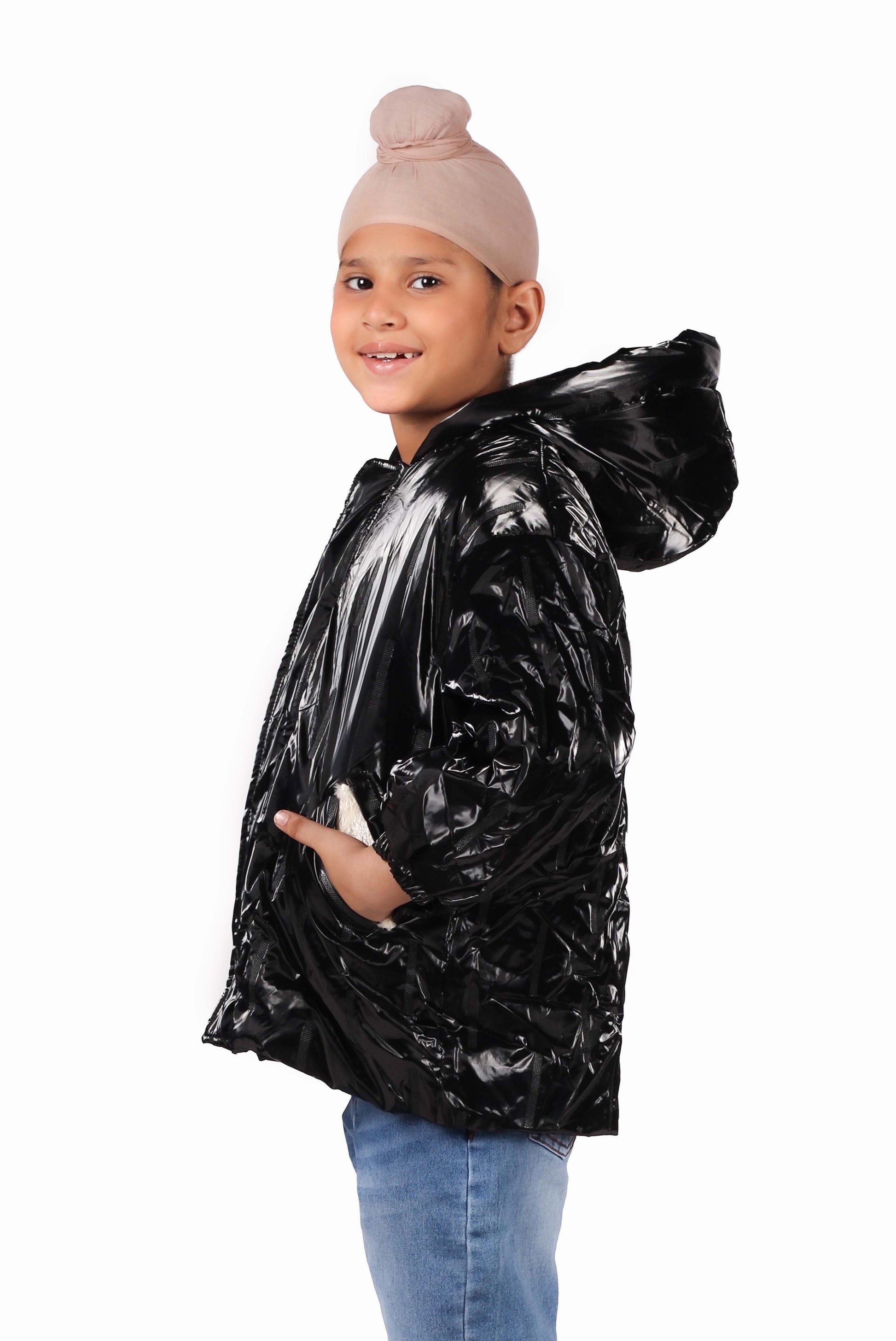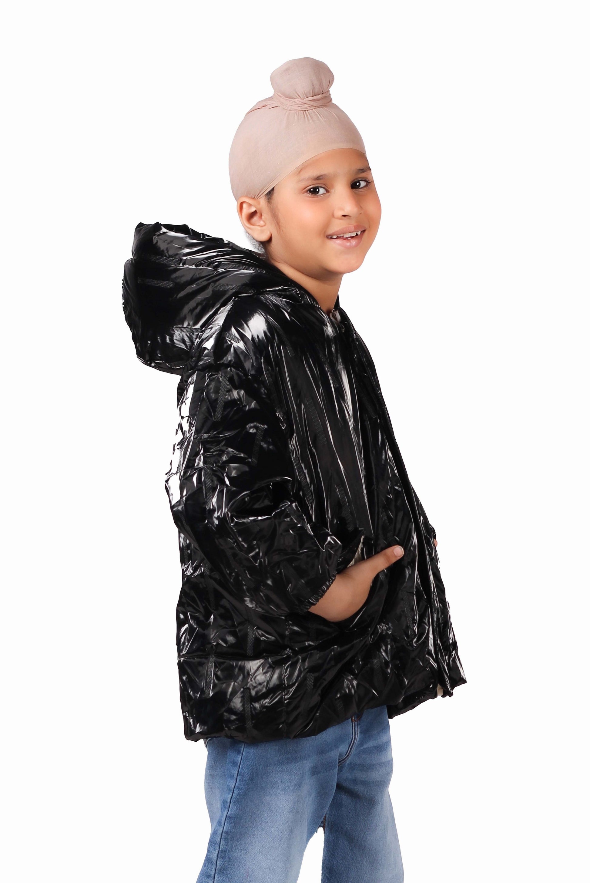 A trendy glossy black puffer jacket with a hood to keep your little one cozy and stylish. Ideal for colder days, offering both warmth and a sleek, modern look.