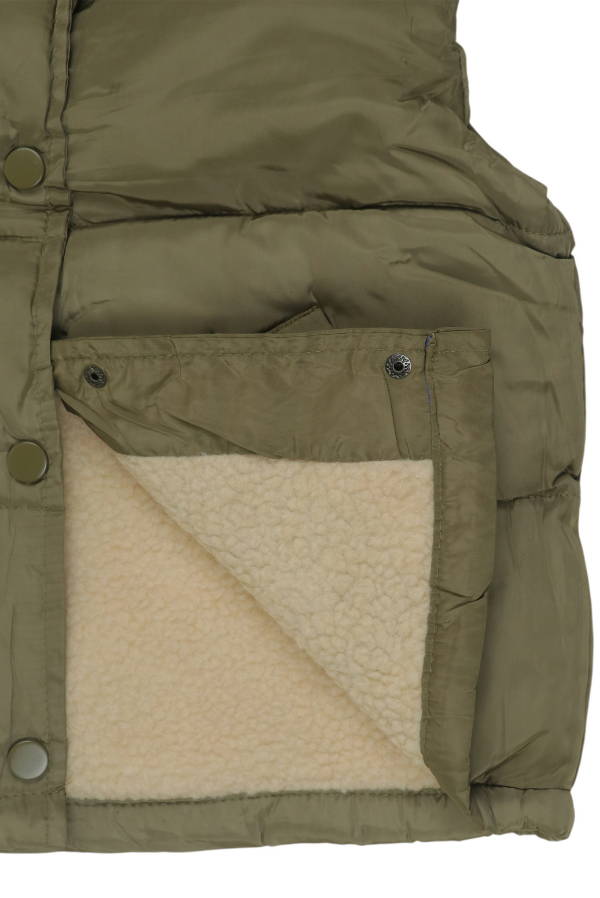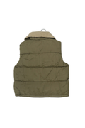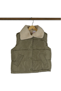 Stay warm in style with this practical olive green quilted vest. Features a cozy sherpa collar, convenient side pockets, and snap-front closure. The perfect layering piece for chilly days, made with durable materials and classic styling. Pairs beautifully with both casual and dressy outfits.