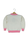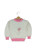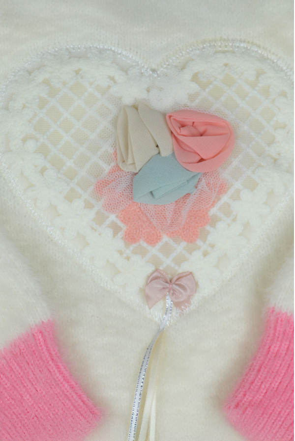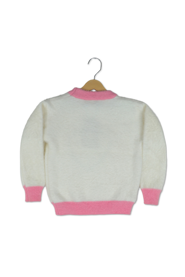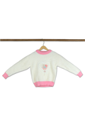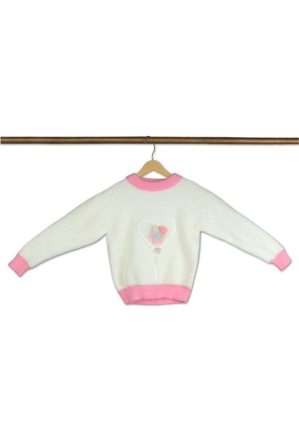 Soft and sweet, this white fuzzy sweater features a delicate heart appliqué with pastel accents. Pink ribbed collar and cuffs add a feminine touch to this cozy piece. Made with plush, comfortable material perfect for keeping warm while looking adorable.