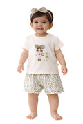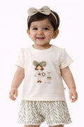 Popskart Baby Girls Cotton Clothing Set | Cute Doll Bow Printed Top & Shorts Outfit | Soft Summer Toddler Dress Set (Cream, 16)