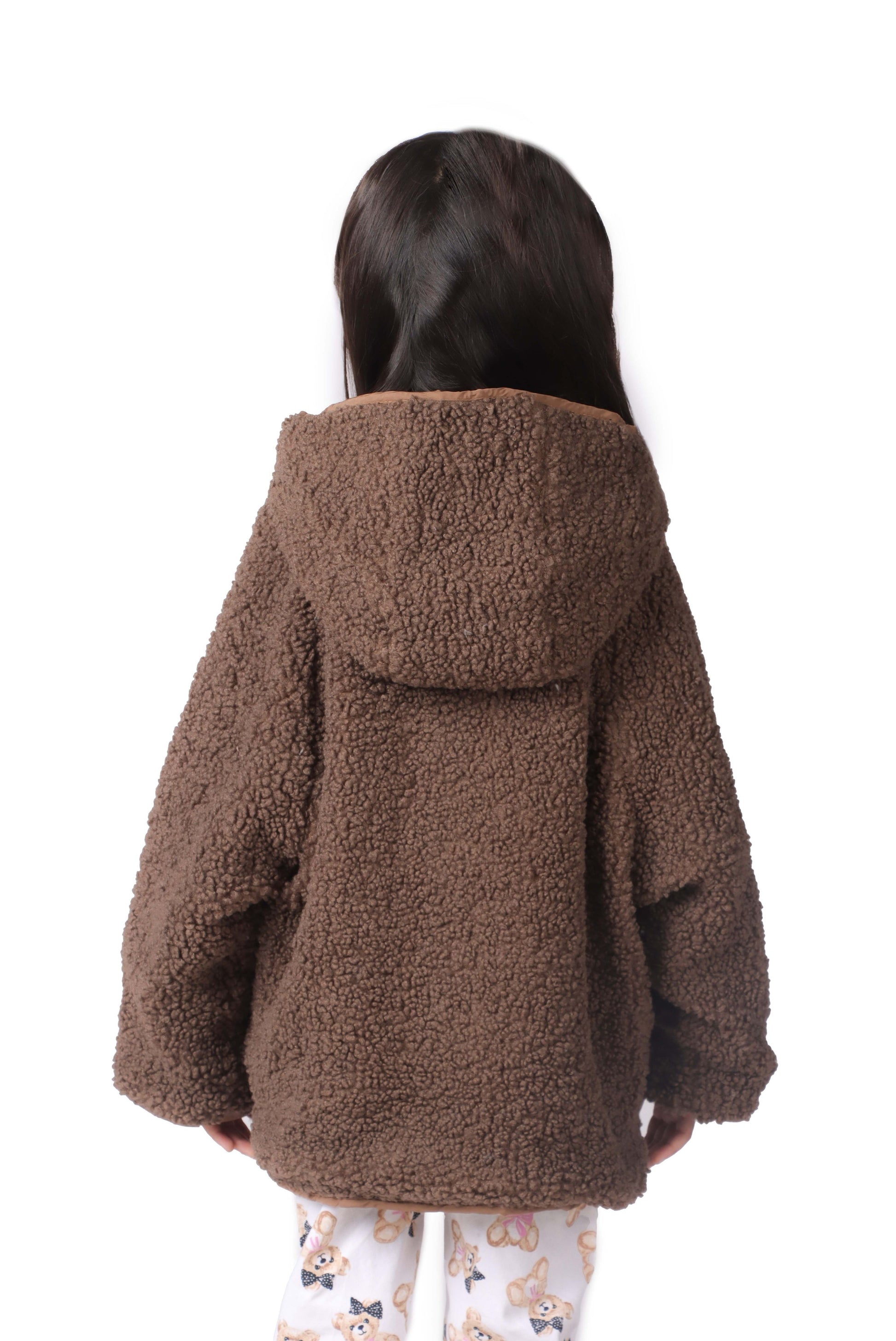 This versatile reversible jacket features a cozy fuzzy texture on one side and a stylish plaid pattern on the other. The warm, oversized fit makes it perfect for colder weather.