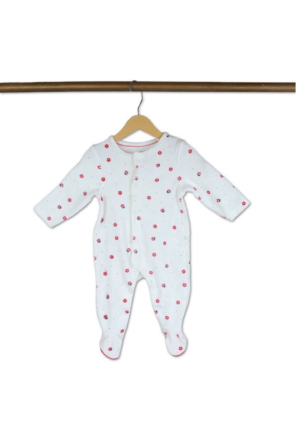 Introduce a touch of floral elegance to your baby's wardrobe with this adorable white baby onesie. This onesie features long sleeves and footed legs, ensuring your little one stays warm and comfortable. The charming pattern of small red and pink flowers adds a delightful and endearing touch, making it perfect for any occasion. Designed with practicality in mind, this onesie includes convenient snap closures for easy dressing and diaper changes. Made from soft, high-quality material, it provides a gentle and cozy feel against your baby's delicate skin.