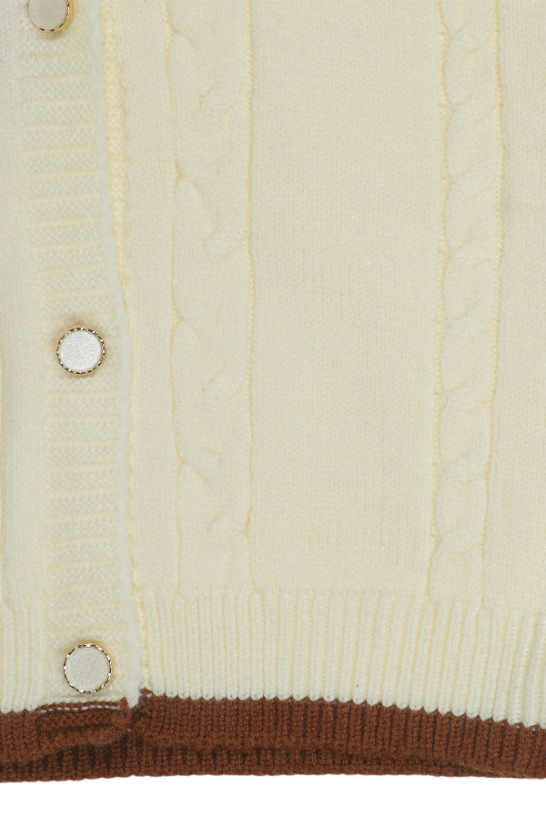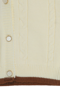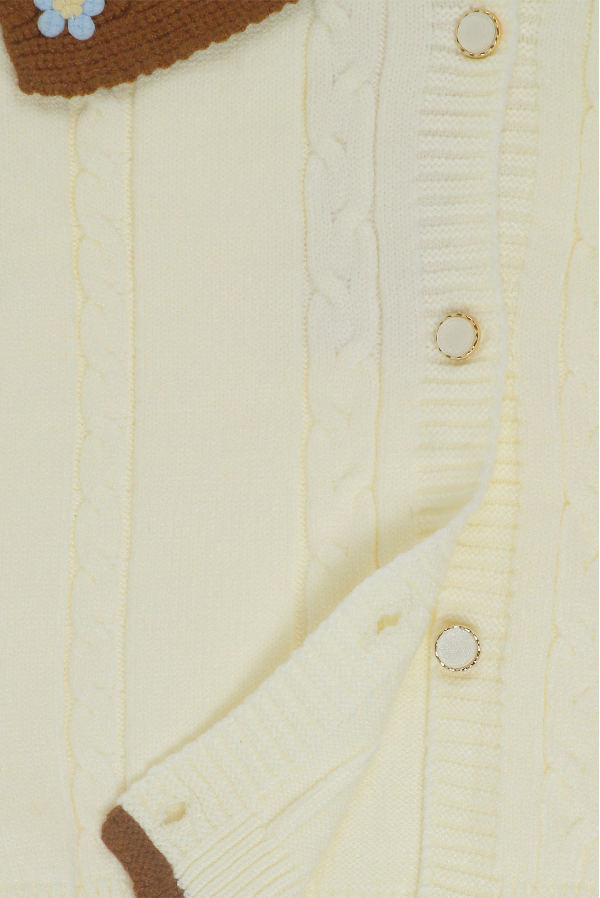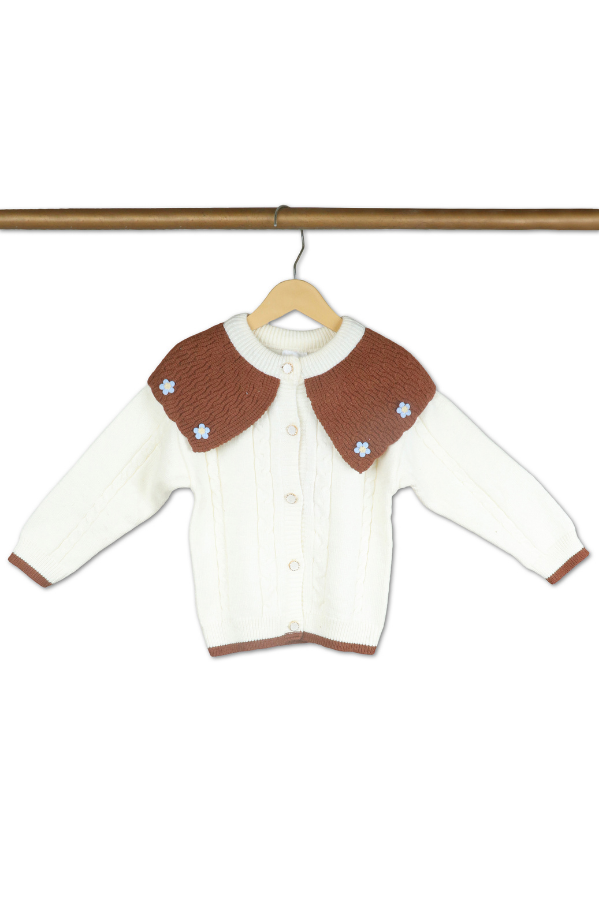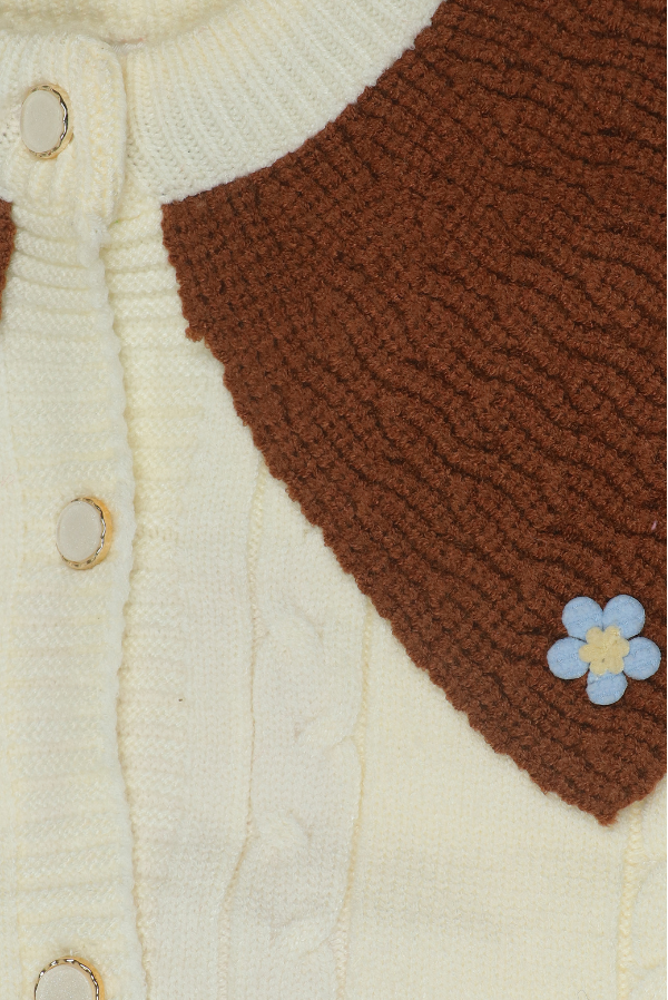 Add a touch of charm to your little one's winter wardrobe with this two-tone sweater with floral accents. Perfect for cozy days, this sweater combines elegance with comfort. A cream base with a warm brown yoke creates a sophisticated and timeless look. The button-down front with white buttons ensures easy wearability, while the ribbed collar, cuffs, and hem offer a snug and comfortable fit.