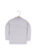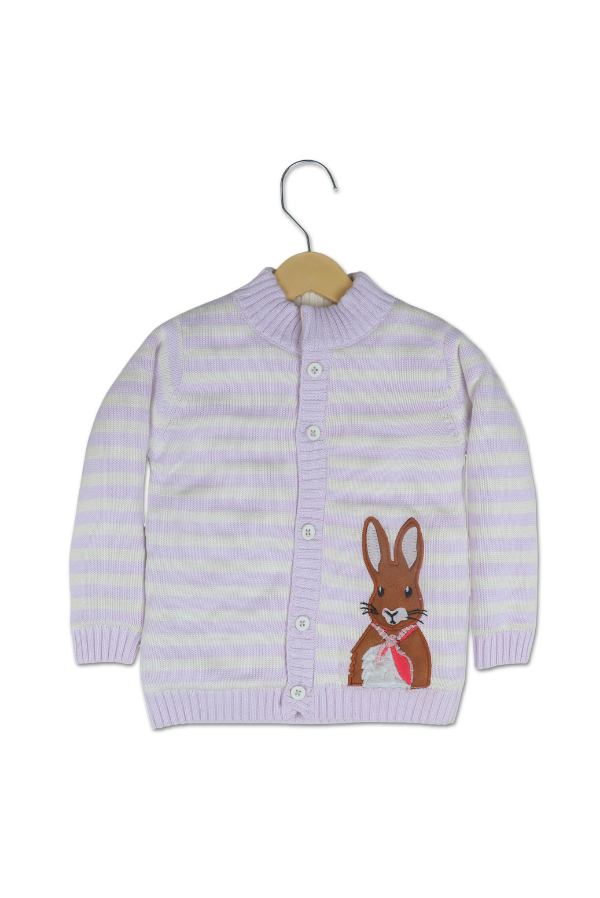 Brighten up your child's wardrobe with this adorable light purple striped sweater. Featuring charming white horizontal stripes and a playful embroidered design of a brown rabbit wearing a red scarf on the lower right side, this sweater is sure to become a favorite. The button-up front with white buttons adds a classic touch, while the ribbed collar, cuffs, and hem ensure a snug and comfortable fit. Made from high-quality materials, this sweater combines both style and warmth, making it perfect for cooler days.