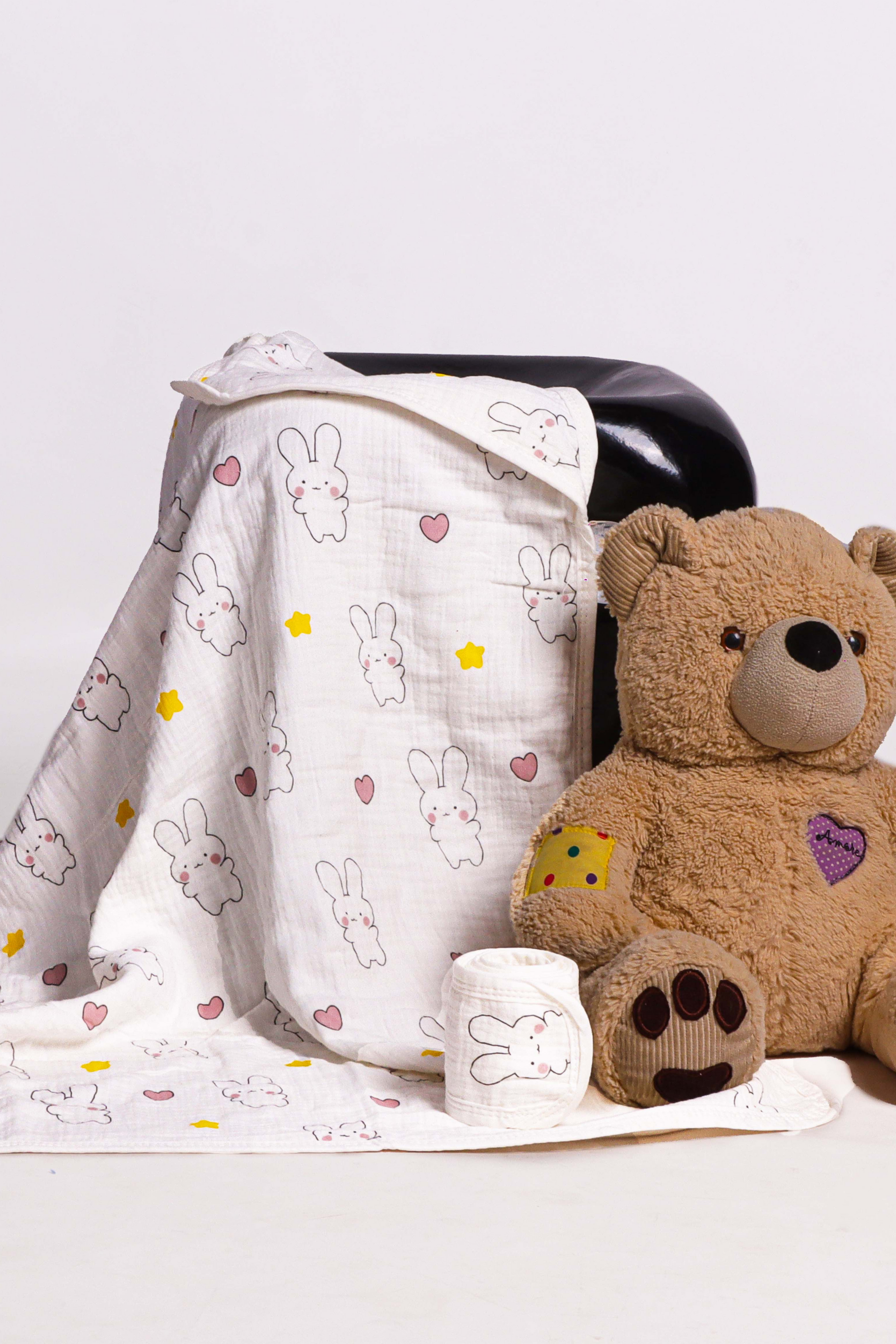 Keep your baby snug and cozy with this adorable white baby wrapper, featuring a charming pattern of cute cartoon bunnies, pink hearts, and yellow stars. The playful and whimsical design is perfect for adding a touch of fun to your baby's essentials. Crafted from soft and lightweight material, this wrapper ensures comfort and warmth for your little one. The wrapper also includes a small rolled-up piece of the same fabric for added versatility. The adorable bunnies, with their pink cheeks and small red noses, create an endearing look that is sure to delight both parents and babies.
